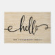 Diese Fußmatte kennzeichnet einen rustikalen, Leinenleinwandblickhintergrund und eine moderne schwarze Typografie, die "hallo" sagt.