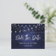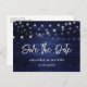 Die rustikale marineblaue Hochzeit bewahrt die Dattelpostkarte mit rustikalem Holz, das mit Lichtern aus der Saite geschmückt ist.