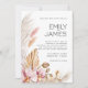 Die rustikale, neutrale, beige und rot-grüne Hochzeitseinladung lädt Sie ein. Dieses moderne böhmische Design mit sanften Aquarellgras, Blätter aus getrockneten Palmen und blühenden, rosafarbenen Blumenakzenten eignet sich hervorragend für Hochzeiten in der Scheune, Feiern im Freien und romantische rustikale Themen.