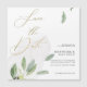 Das elegante Design des Hauses besticht durch einen grünen botanischen Olivenzweig, ein Symbol der Ruhe, vor einem transparenten Aquarell. Diese rett-the-date-Karte in einer einfachen Goldkalligraphie-Schrift ist Teil eines Set, das in unserem Design Curve Studios Shop gefunden wurde. Ein wunderschönes Hochzeitsthema für Frühling, Sommer oder Herbst. Einfache Anpassung an Ihre persönlichen Daten.