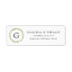 Rustikale Rücksendeadressen-Aufkleber mit Ihrem Monogramm in einem grünen Olivenblattkranz, verlassen von Ihrem Namen und Ihrer Adresse in einem mittelgrauen Schriftart, auf weißem Hintergrund. Dieses Design ist perfekt für eine Sommerhochzeit.