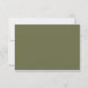 Dieses rustikale Hochzeitsdesign im RSVP-Design zeigt die Monogramm-Initialen von Braut und Bräutigam in olivgrün, gerahmt durch einen Aquarellkranz von Oliven und Grünpflanzen auf der links Seite. Die Wörter "Kindly Reply" erscheinen in olivgrüner Handschrift. Passen Sie den kohlegrauen Text an, mit Platz für eine Online-UAWG mit Website-URL. Die Rückseite der Karte ist solide olivgrün.