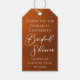 Dieses rustikale orange-braune Hochzeitsdusche-Geschenk-Anhänger verfügt über eine schöne weiße Typografie für eine Herbstparty mit Boho-Farben für eine Hochzeit im Herbst. Minimalistische weiße Typografie für eine bohemianische Braut.