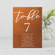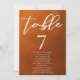 Befolgen Sie den Herbstfarben-Trend mit unserer Tischnummer der Orange- bis Braungradienten-Hochzeit im Herbst mit Namen. Einfache weiße Typografie auf einer rustikalen Karte für einen minimalistischen Look. Bohemische Farbtöne, die an Terracotta-Ton erinnern, unterstreichen Ihre elegante Kalligraphie auf dieser angesagten, texturierten Beschriftung.