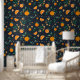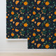 Akzentuieren Sie Ihre Wände mit dieser gemusterten Tapete aus Zitrusfrüchten. Es bietet lebendige Orangen und Orangenblüten mit blühendem Blattwerk, das auf einem dunkelblauen marineblauen Hintergrund tanzt.