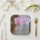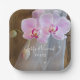 Personalisieren Sie die Rustikale Elegance Land Hochzeitsbuch Teller zur Verfügung mit den Namen der Braut und Bräutigam und Datum für die Verwendung in Ihrem lässigen und dennoch klassischen Ranch Thema Brautparty oder Scheune Party Ehe Empfang. Diese informellen und eleganten Teller mit Einwegpapier für Nuptien sind mit einem malerischen Blumenfoto aus rosa Phalaenopsis oder orchiden Blume am Stamm und einem weißen Brautschleier mit einem verwitterten braunen Holzhintergrund versehen.