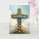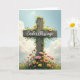 Dieses Design zeigt ein verwittertes Holzkreuz, das hoch auf einem Frühlingsfeld steht, umrankt von grünen Reben und kleinen gänseblümchenähnlichen Blumen in Weiß und Gelb. Direkt unter dem Querbalken erscheinen die Worte „Easter Blessings“ in leuchtend weißer Schrift, zentriert, sodass sie sich klar gegen das dunklere Holz abheben. Rund um den Sockel breitet sich ein dichter Teppich aus Frühlingsblumen in Rosa, Sanftorange, Sonnengelb und Cremeweiß aus wie eine sanfte Opfergabe, wobei die Farben eng beieinander liegen, wie es Freunde in einem stillen Moment tun könnten 🌷. Die grüne Wiese erstreckt sich in die Ferne und gibt der Szene Raum zum Atmen, während der Fokus auf dem Kreuz bleibt. Darüber öffnet sich ein klarer blauer Himmel mit einigen weichen, gerundeten weißen Wolken, die vorbeiziehen und eine ruhige, luftige Kulisse schaffen. Licht fällt auf die Holzmaserung, die Blätter und die Blütenblätter und lässt die Blumen frisch geöffnet erscheinen, als wenn sie sich einander zuneigen 🐰. Das