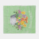 Diese personalisierte, blumengeschmückte Fleecedecke mit Osterwein ist rustikal gestaltet und besteht aus einem weißen Korb mit gelben und lila Frühlingsblumen und Ostereiern in Gelb-, lila-, Grün- und Türkistönen. Ihr Familienname ist in weißer Typografie auf einem Imitat mit grün verwittertem Holz gehalten. Entworfen von dem weltbekannten Künstler ©Tim Coffey.
