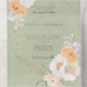 MIT ODER OHNE QR CODE ZUM SCAN ODER MIT ODER OHNE ABENDESOPTIONEN. Das Ganze in einem einladenden Hochzeitsdesign besticht durch einen wunderschönen Blumenrahmen aus weichem Pfirsichrot und Rosen mit anderen weißen Blume auf einem hellgrün-weißen Hintergrund. Frisch und romantisch, von Simply Farmhouse Press kreiert.