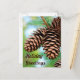 Auf dieser Postkarte befindet sich ein Foto von Pinecones, die an einem Zweig hängen. Der Hintergrund ist in sanften Blau- und Grüntönen gehalten. Es heißt "Holiday Greetings", aber Sie können es mit Ihrem eigenen Text personalisieren.