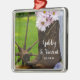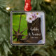 Gedenken Sie Ihre Ehe mit dem charmanten rustikalen Pink Daisies und Cowboy Boots Country Wedding Ornament. Dieses lässige und dennoch elegante Weihnachtsgeschmack mit individuellem Ranch-Thema zeigt ein malerisches Blumenfoto mit braunen Western-Cowboystiefeln aus Leder, gefüllt mit einem Bouquet aus rosa Blume und einem weißen Brautschleier mit einem alten Wagenrad und einem verwischten grünen natürlichen Hintergrund.