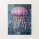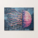 Ein Ölgemälde im rustikalen Stil, in dem eine rosa und lila Qualle, die anmutig vor einem tiefblauen Hintergrund schwebt, die Schönheit des Meeres mit ihren satten, stimmungsvollen Tönen verbindet.