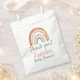 Mit dieser hübschen Baby-Duschtasche, die mit einem handgemalten Regenbogen in warmen, erdigen Pastelln über einem herzlichen "Danke!" und dem Namen des Babys ausgestattet ist, möchten wir Sie ganz herzlich willkommen heißen. Seine moderne, boho inspirierte Optik, die Gender-neutrale Palette und das sanfte, minimalistische Design machen es zur perfekten Touch für Babyfeiern, Gastgeschenke oder wohlüberlegte Wertgeschenke. Dieser sehr schicke Akzent koordiniert sich mühelos mit zeitgenössischen oder Vintagen thematischen Ansammlungen und lasse jedem Gast zu wissen, wie besonders sie sind.