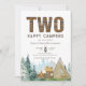 Diese lustige rustikale Einladung hat einen holzgetäfelten "ZWEI" und glücklichen Camper. Der Boden hat einen Aquarellwald, Berge und Landschaft. Es ist mit den bräunlichen, grünen und braunen Camping, die ein Zelt und einen Kamin enthalten, geschmückt. Der Rücken hat ein Muster des gleichen Aquarellzeltes.