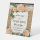 Romantisches Hochzeitsschild mit Rose und grünen Blätter auf rustikalem Holz mit Burlap und Spitze. Schön für eine Garten- oder Scheunenhochzeit oder eine Feier im Hinterhof. Ein passendes Gästebuch finden Sie hier: https://www.zazzle.com/rustic_wood_roses_romantic_wedding_guest_book-256999603104074523