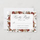 Diese elegante, blumengeschmückte RSVP-Karte, die sich mit unserer Hochzeitskollektion Rustic Burgundy und Ivory Rose abstimmen lässt, bietet Ihnen das gewünschte Reaktionsdatum und die Möglichkeit, den Wortlaut zu akzeptieren und abzulehnen, gerahmt durch Aquarellfarben und Blattwerk in Bordeaux-, Elfenbein-, Rost-, Braun-, Grün- und Goldtönen. Die Rückseite der Karte zeigt einen soliden bordeauxroten Hintergrund, der ein reichhaltiges und zusammenhängendes Finish verleiht.
