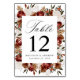 Elegante, blumengeschmückte Tischnummern mit Tischnummer, Namen und Hochzeitsdatum, gerahmt von Aquarellfarben und Blattwerk in Bordeaux-, Elfenbein-, Rost-, Braun-, Grün- und Goldtönen. Das Design wiederholt sich auf der Rückseite. Entworfen, um mit unserer Hochzeitskollektion Rustic Burgund und Elfenbeinküste Rose zu koordinieren. Um dieses Design zu bestellen, passen Sie bitte die Tischnummern einzeln an und fügen sie dem Warenkorb individuell hinzu.