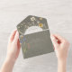 MIT ODER OHNE QR CODE VERFÜGBAR. Dieses Design zeichnet sich durch eine weiche Wildblume rund um ein Cremeoval auf einem smaragdgrünen Hintergrund aus. Personalisierte All-In-One-Einladungen sind eine einzigartige Kombination aus einer schön gedruckten, maßgeschneiderten Einladung und einer leicht zu abreißenden perforierten UAWG-Postkarte. Und sie sind so einfach zu bedienen! Man falte einfach, dann Siegel die Rückklappe mit den drei beiliegenden Klarkleben, und Post. Und wenn Ihre Gäste Ihre persönliche Einladung erhalten, reißen sie einfach die perforierte RSVP Karte ab und lassen sie in der Mail an Sie zurück!