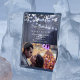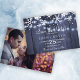 Moderne Hochzeitskartentafel Save the Date mit eigenem Foto auf der Rückseite (Vollblutwaage / Querformat). Die weißen Schneeflocken und die aufhängenden Tinkellichter auf dem dunkelblauen, grauen Holzboden machen ein schönes Winterdesign auf der Vorderseite. Ideal für einen rustikalen und eleganten Winter | Saisonale Wunder thematische Hochzeit.