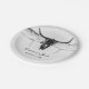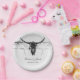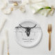 Rustikaler weißer Bullenskull, Western Cowboy Hochzeitsempfang rund Papier Teller. Vintages modernes Bauernhaus bedruckte bedrückte Textur. Alte wilde westliche Stil antike, coole, trendige Bauernhof Tierdesign. Passen Sie Ihr Skript an. Bildrecht Marg Seregelyi Fotografie.