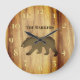 Silhouette eines schwarzen Bären auf rustikalen Holzplanken. Anpassbarer Name der Familie oder Lodge. Rustikale Berghütte Stil.