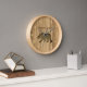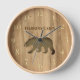 Silhouette eines schwarzen Bären auf rustikalen, hellen Holzplanken. Anpassbarer Name der Familie oder Lodge. Rustikale Berghütte Stil.