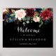 Dieses rustikale, schwarz-botanische Begrüßungszeichen ist perfekt für eine klassische Hochzeit. Das Design besteht aus bordeauxroten, marinierten, blauen und rot strahlenden Blume mit anmutigen, handbemalten, schwarzen Hintergrund, die die natürliche Schönheit inspiriere. Machen Sie dieses Poster zu Ihrem eigenen, indem Sie den Namen der Braut und Bräutigam, und das Datum der Hochzeit.