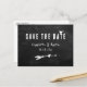 Eine maßgeschneiderte rustikale Chalkboard-Hochzeit speichert das Datum der Postkarten mit den Details der Hochzeit, Herz und Pfeil auf einem schwarzen Chalkboard-Hintergrund.