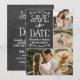 Whimsikale und einzigartige zweiseitige Foto Collage Ankündigung Karte speichern die Daten mit einem rustikalen strukturierten Look Blackboard Hintergrund mit handgeschriebenen Stil Schriftart, die ein weißes Kreide Aussehen. Personalisieren Sie mit den Hochzeitsdetails und drei (3) beliebten Verlobung-Fotos.