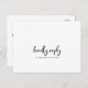 Dieses rustikale Skriptlied Anfrage UAWG postcard ist perfekt für eine Hochzeit auf dem Lande. Das schlichte und moderne Schwarz-Weiß-Design besticht durch eine einzigartige handgeschriebene Kalligraphie mit zeitgenössischem minimalistischem Boho-Stil. Anpassbar in jeder Farbe. Behalt das Design minimal und simpel, wie es ist, oder personalisiere es durch Hinzufügen von eigenen Grafiken und Kunstwerken. Bauen Sie Ihre Hochzeitsgast-Liste und Ihre Tanzfläche-Liedliste auf einmal! Diese Hochzeitstitel-Postkarte frage den Gästen bequem, ob sie an Ihrer Hochzeit teilnehmen können, und auch, welches Lied sie zum Tanzen bringen wird.