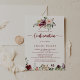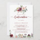 Diese rustikale Sommerblumenkalligraphie-Einladung ist perfekt für ein einfaches religiöses Ereignis. Die Blume sind bordeauxrot, rosa und rot, das Wasser ist mit grünen Blätter in einem bräunlichen Hintergrund.