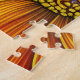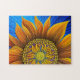 Eine stilisierte abstrakte Darstellung einer Sonnenblume mit fett gesäumten Linien und auffälligen Farbkontrasten. Die Sonnenblume selbst wird in Golden, Gelbtönen und Orangen gehalten.