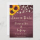 Laden Sie Freunde und Familie zu Ihrer rustikalen Hochzeit ein! Diese hübsche Save the Date-Karte zeigt eine Sonnenblume, einen bordeauxfarbenen Holzhintergrund und Lichter an der Saite. Passen Sie Ihre Namen, Ihr Hochzeitstermin und Ihre bevorzugte Formulierung an. Sehen Sie andere Artikel in dieser Kollektion mit diesem rustikalen Holz Sonnenblumen-Design.
