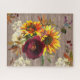 Verbringen Sie mehrere schöne Stunden damit, dieses hübsche, aber herausfordernde Puzzle zusammenzubringen. Ein großer Blumenstrauß in der Mitte ist mit zwei Sonnenblumen, einer bordeauxroten Blume, einer weißen Blume aus Elfenbein und Lilacs ausgestattet. Lilacs, Beeren und Blätter ergänzen das Design am Rande. Ein Holzkornmuster-Hintergrund verleiht ihm ein warmes rustikales Landgefühl.