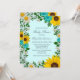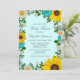 Rustikale Babydusche mit blühenden Sonnenblumen, traditionellen Weißtönen und aquamarinen Blume vor einem hellen Aquarelang mit Babyatmen und botanischen Akzenten im Grünen