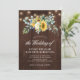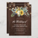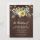 Eukalyptus und Sonnenblumen Blumendesign mit rustikalem Holzboden. Sie können die Formulierung, Textgröße, Farben und Schriftart auf dieser Hochzeit einladen.