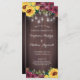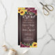 Die Hochzeitsfeiern sind mit Sonnenblumen und bordeauxfarbenen Blume auf einem Holzkornboden mit Glaskeramikleuchten ausgestattet. Personalisieren Sie sie mit Ihrem Text. Diese Hochzeitsprogramme sind Teil einer Sammlung, die eine Reihe von passenden Hochzeitswaren enthält, die Sie für Ihre Hochzeit personalisieren können. Bitte besuchen Sie unser Geschäft, um das komplette Sortiment zu sehen.