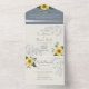 Mit dieser wunderschönen Sonnenblume und der staubigen blauen Einladung verleihen Sie Ihrem Hochzeitstag rustikalen Charme und Eleganz. Dieses Design ist perfekt für Hochzeiten im Frühjahr oder Sommer geeignet und verbindet die Wärme der Sonnenblumen mit der coolen Eleganz von staubblauem Blau und schafft so ein perfektes Gleichgewicht von rustikal und raffiniert. Das All-in-One-Format beinhaltet Ihre Hochzeitsdetails, eine abreißende UAWG-Postkarte und Platz für zusätzliche Informationen, alles in einem komfortablen, individuell anpassbaren Paket.