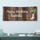 Das Party "Happy Birthday" mit rustikalen Cowboystiefeln, hellgelben Sonnenblumen und wunderschönen blauen Rose auf dunkelbraunem Holzboden. Personalisieren Sie mit dem Namen des Ehrengast.