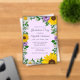 Rustikale Abschluss-Einladung mit lebendigen Sonnenblumen, traditionellen Weißtönen und farbenfrohen violetten Blumen vor einem lila Hintergrund mit Babyatmen und botanischen Akzenten im Grünen