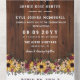 Rustikal in einer Hochzeitseinladung mit bedrucktem Holzlook und Blume Arrangements mit gelben Sonnenblumen und bordeauxfarbenen Gängen und blütigen Blume mit Grün und Beerenzweigen.