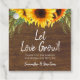 Dieses rustikale Gastgeschenk Hochzeit-Tag enthält den Text "Liebe Lass Grow". Der dunkle Holzboden wird durch eine Aquarellgrafik einer eleganten Gruppe von Sonnenblumen mit Laub hervorgehoben. Benutzerdefinierter Text erlaubt es Ihnen, Ihre eigene Nachricht zu personalisieren.