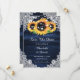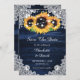Die Hochzeit mit Navy und Sonnenblumen bewahrt die Dattelkarten mit Sonnenblumen und weißer Blütenspitze vor einem rustikalen Holzhintergrund. Matching-Elemente verfügbar.