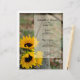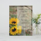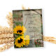 Das gemütliche und dennoch elegante Rustikale Sonnenblumen- und Wagon Wheel Country Wedding Menü mit den Details des Essens, das Sie in Ihrem Western Ranch Thema Brautparty, Ehe Empfang Dinner oder Post Hochzeit Brunch servieren. Personalisieren Sie es mit den Namen der Braut und des Bräutigams, Ort und Datum. Dieses zauberhafte Speisenangebot mit Blumen und Brauereien umfasst ein malerisches, digital gemaltes Blumenfoto mit gelben Sonnenblumenblüten und ein rostiges altes Wagenrad.