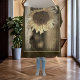 Das Foto der Sonnenblumen wird mit einem digitalen Alterungsprozess nah, mit einem Vintagen Lagerhausüberlagerungsblatt und einer Biene in der unteren rechten Ecke.