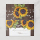 Elegante Blumen-Hochzeitsvorlage mit orange-gelben Sonnenblumenbouquets, Streicher aus binkelfarbenem Licht und dunkelbraunen Schriftzeichen auf einem Stallholzhintergrund. Ideal für den Sommer | Garten | Garten im Freien oder Herbst rustikale Hochzeiten oder andere Party.