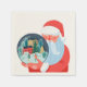 Rustikaler Stil Santa hält einen Globus mit einer Stadt, gefrorenen See und Skatern.