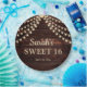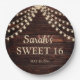 Sweet 16 Teller mit eigenem Geburtstagsfeier mit einem rustikalen dunkelbraunen Stallholzhintergrund und funkelnden Saitenleuchten. Personalisiert mit dem Namen der Ehrengast und dem Datum ihres Party.