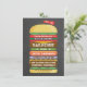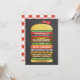 Einzigartiger Staplungshamburger mit Zwiebeln, Essiggurke, Kopfsalat, Würstchen, Käse, Senf, Ketschup, auf einem Tafelhintergrund. Ein rotes Picknickmuster des Ginghams ist auf der Rückseite der Einladung. Ihr Gast wird Liebe diese einzigartige Einladung. Fertigen Sie mit Ihrem eigenen Text besonders an. Bitte Karo mein Speicher für eher wie dieses. Ursprüngliche Illustration durch pj_design. Emailen Sie mich, wenn Sie Hilfe benötigen. Sie können dieses eine größere Karte machen, indem Sie sie besonders anfertigen und auf den Papierwahlen klicken.