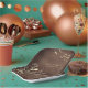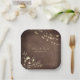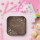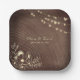 Elegante rustikale Papiertafel für Hochzeiten, mit Holzstruktur, leuchtenden Lichtern und goldenen Blumenakzenten. Personalisiert mit Namen und Datum der Paare - ideal für Empfänge oder Desserttische.
